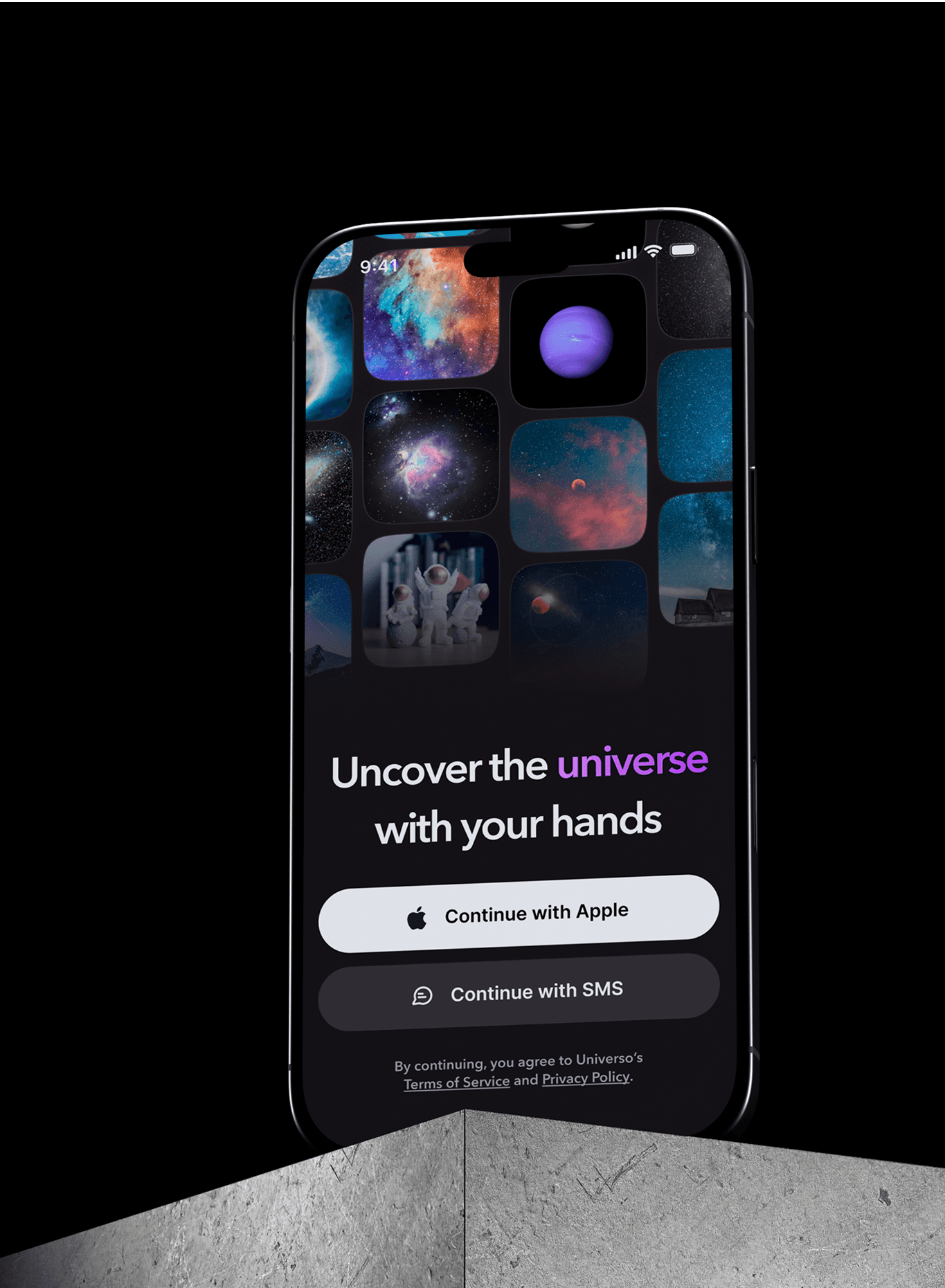 A mobile app login concept for an app that connects people who love the universe.